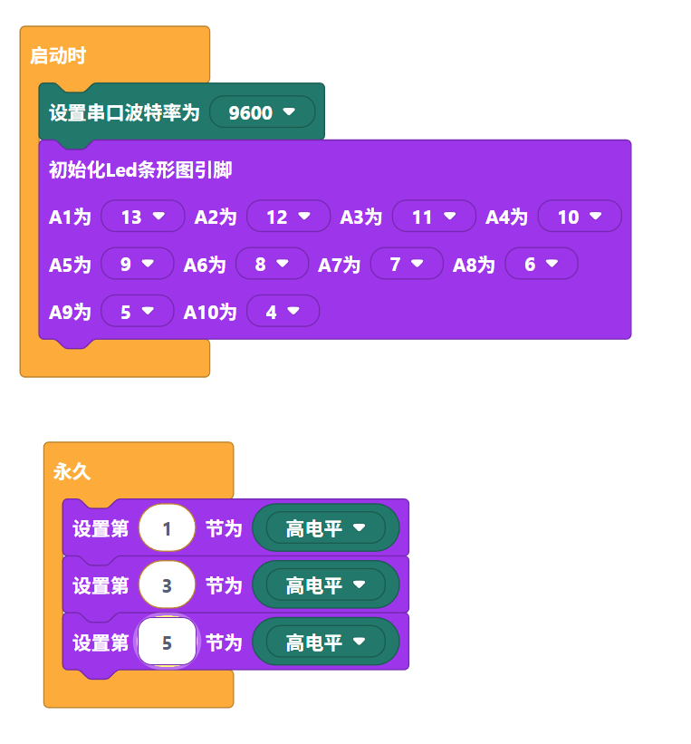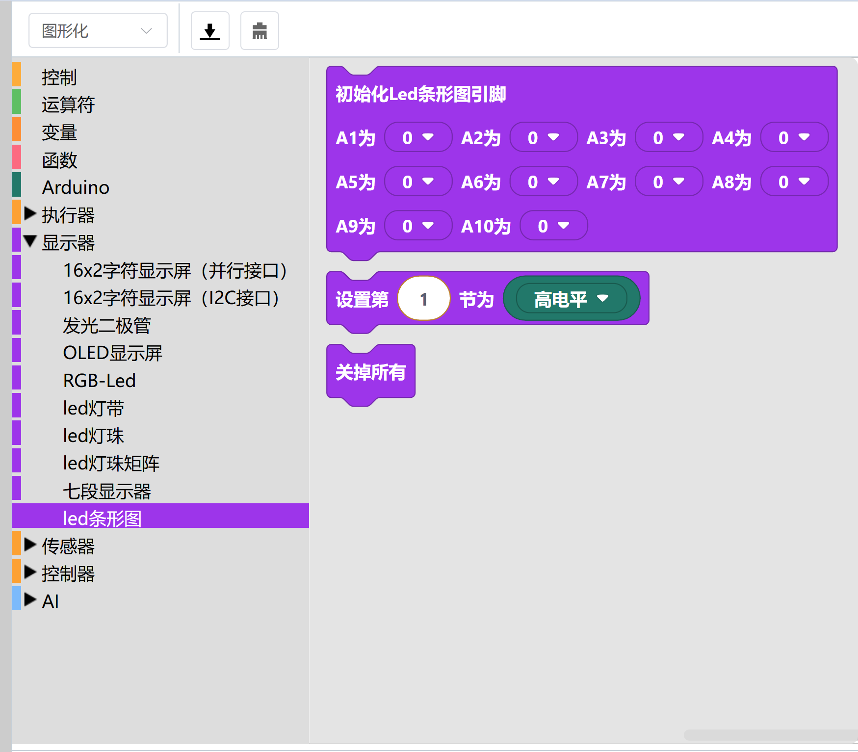 可在“显示器”中的“led 条形图”,找到对应图形化代码块。