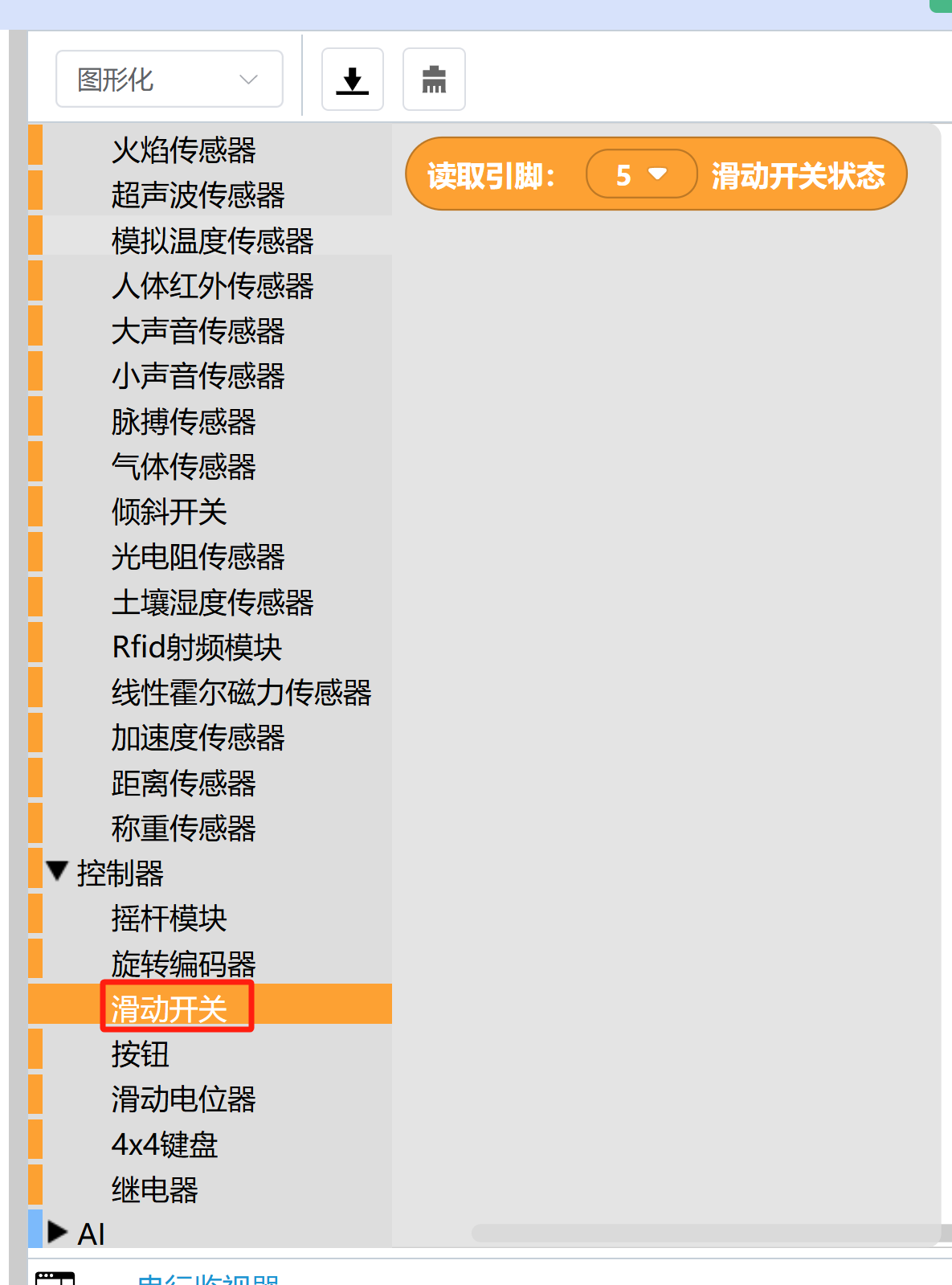 可在“控制器”中的“滑动开关”,找到对应图形化代码块,也可“读取数字引脚”来获取相应数值。