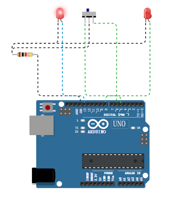滑动开关具有 ON-OFF-ON 这样的结构,当开关滑动到一侧是,一侧端口就闭合形成回路,表现为高电平,下面结合控制两个 LED 灯给出示例代码