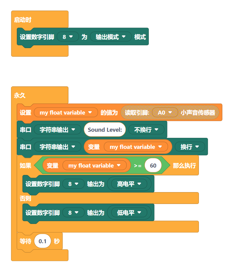 为了更好的演示小声音传感器感知音量以及控制功能,下面结合控制一个 LED 灯进行演示。