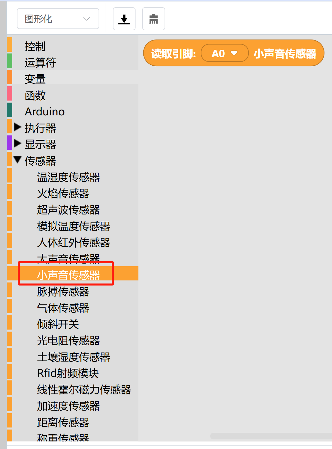 可在“传感器”中的“小声音传感器”中,找到对应的图形化代码块。
