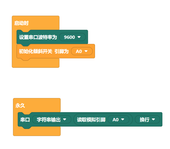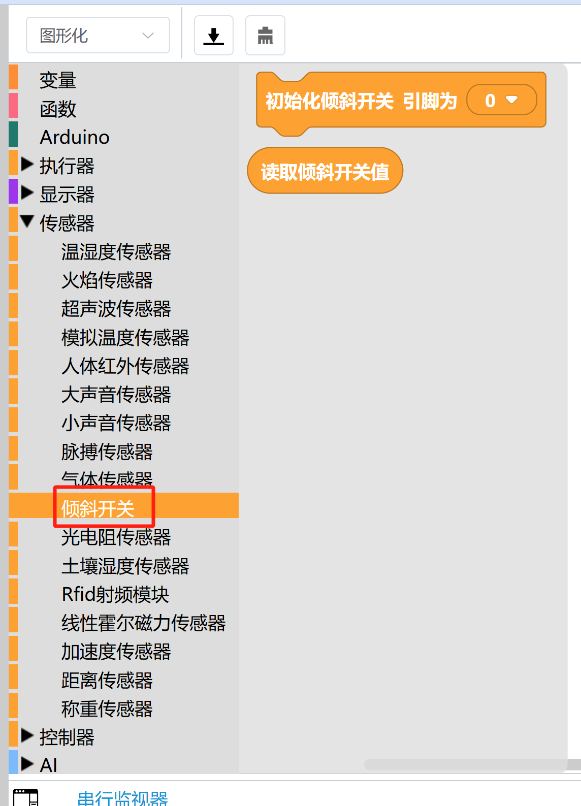 可在“传感器”中的“倾斜开关”,找到对应的图形化代码块。