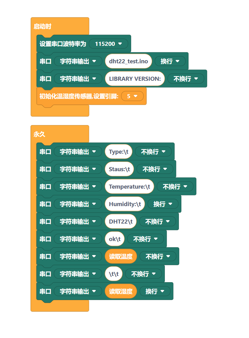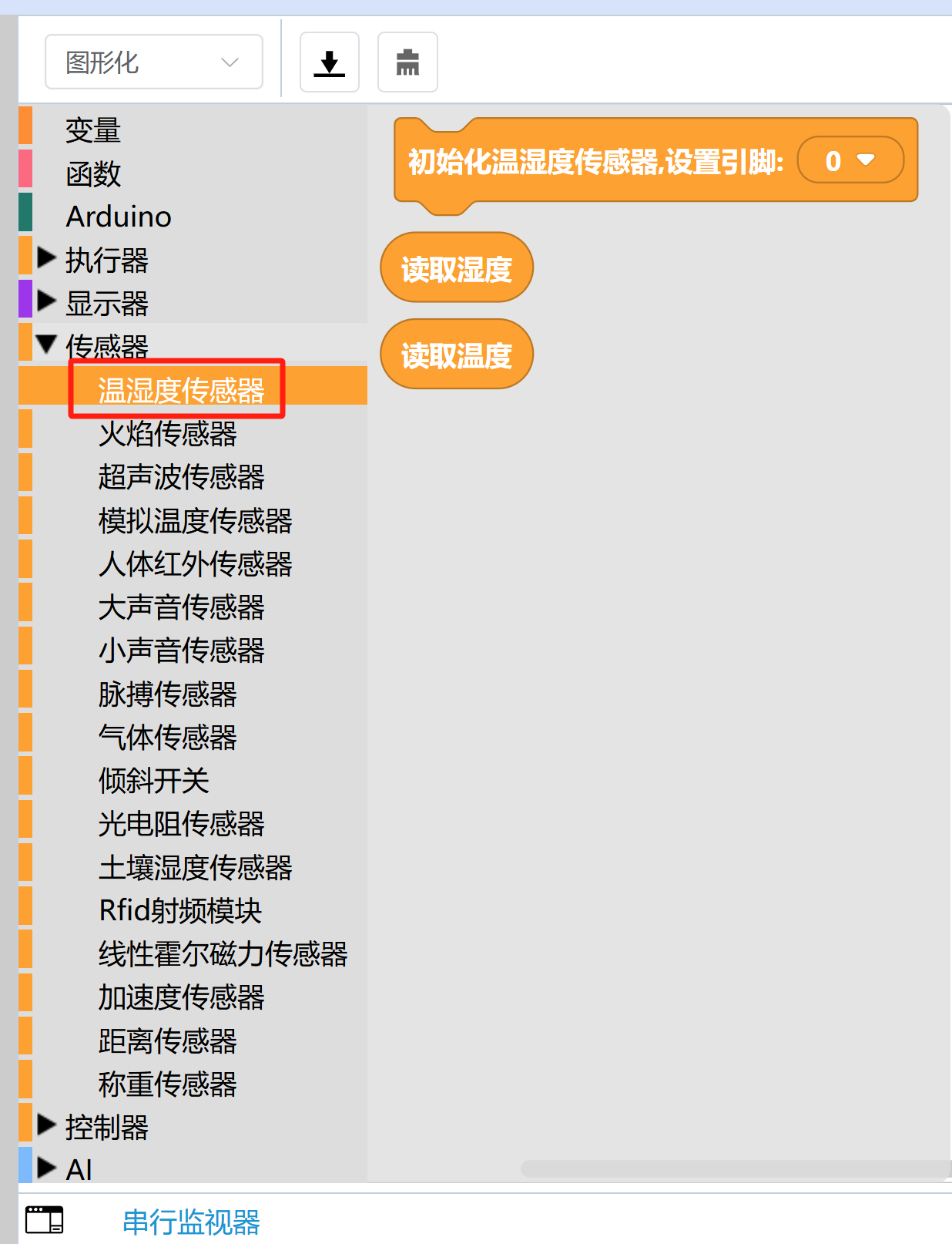 在“传感器”中的“温湿度传感器”中,可以找到读取温湿度传感器的图形化代码块。