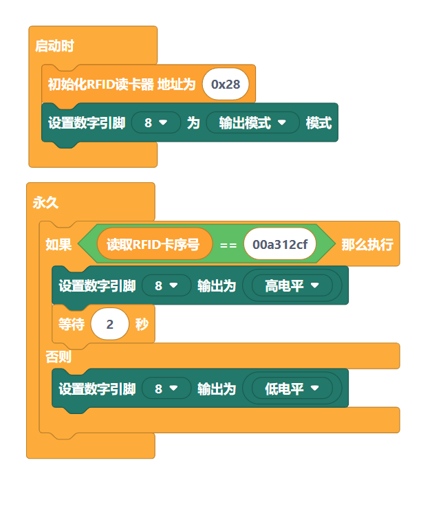 可在“传感器”中的“Rfid 射频模块”,找到对应的图形化代码块。