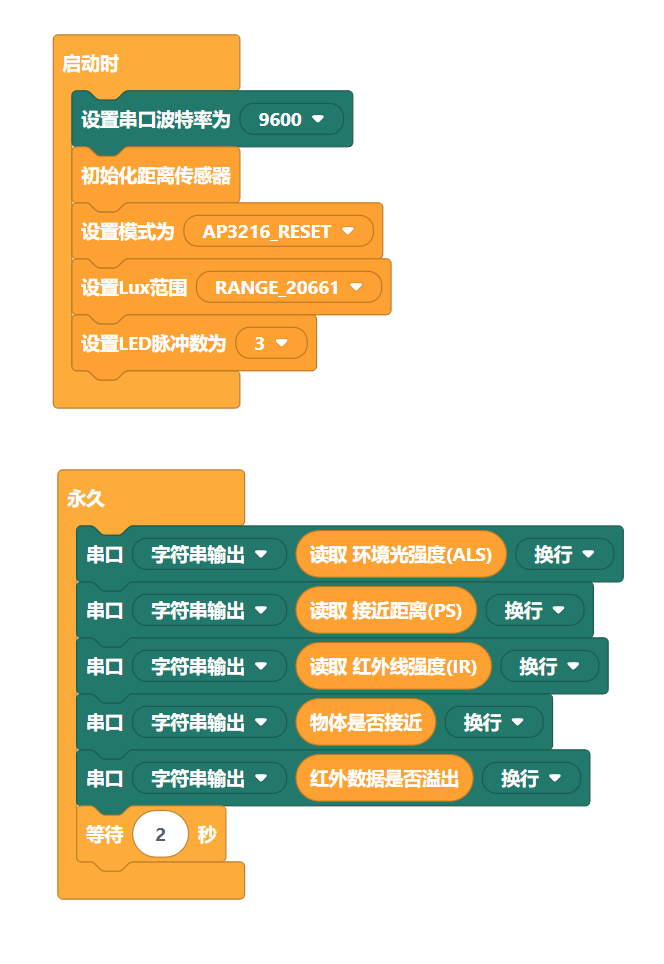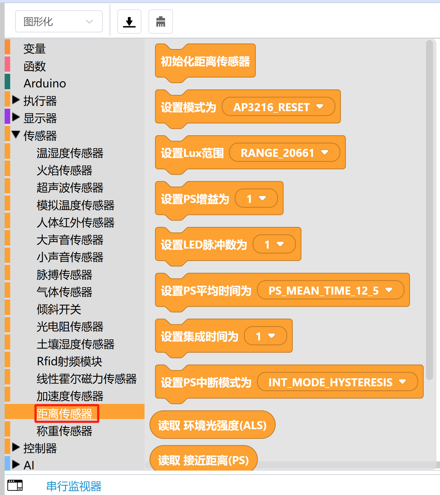 可在“传感器”中的“距离传感器”,找到对应的图形化代码块。
