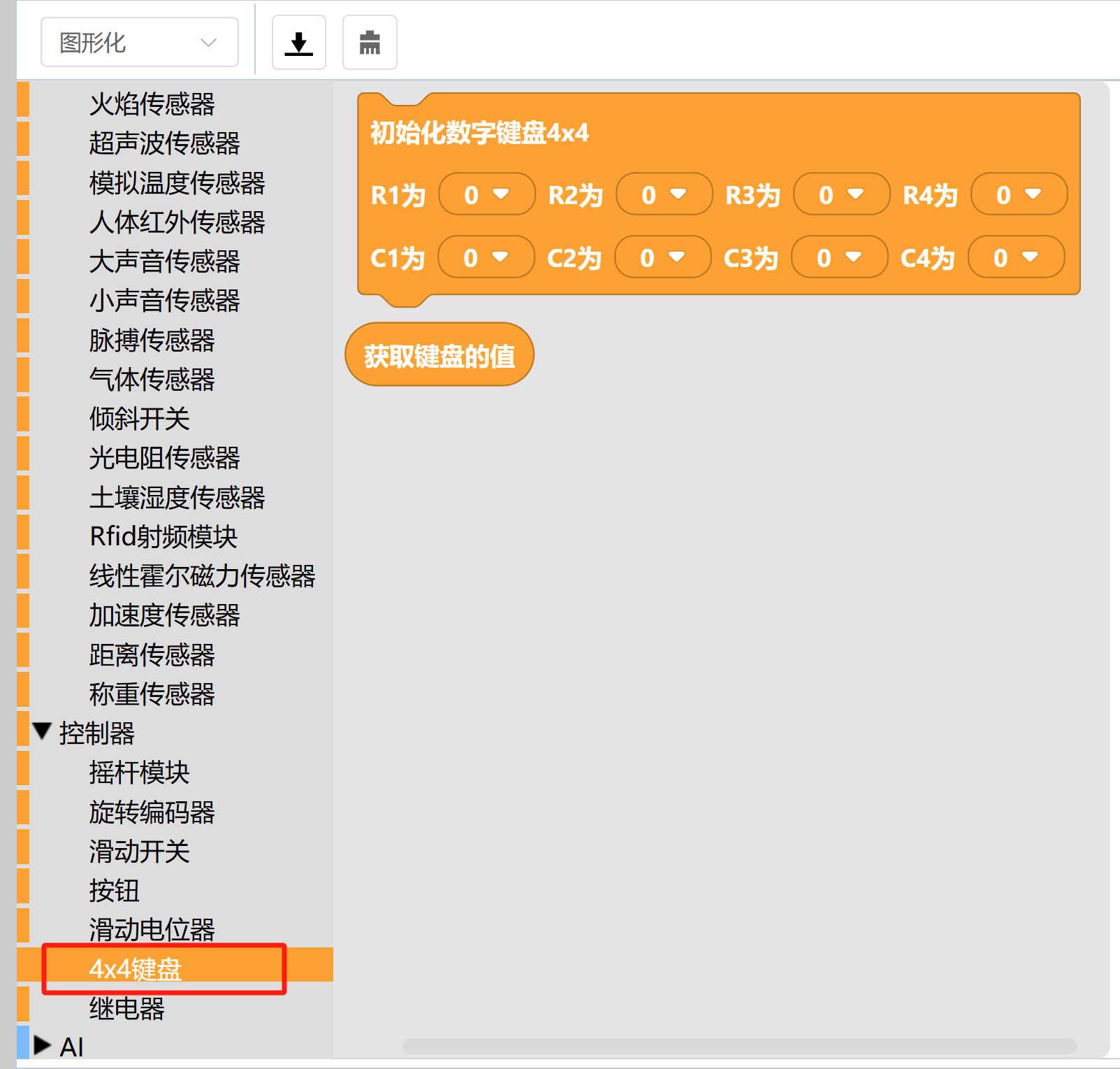 可在“控制器”中的“4*4 键盘”,找到相关的图形化代码块。