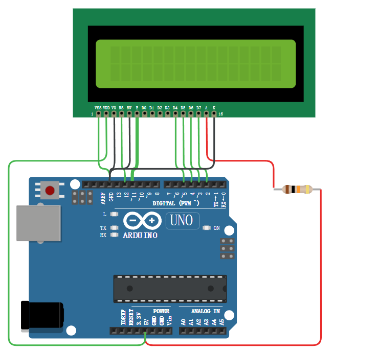 - A:背光源正极引脚,连接 Arduino 板的 5V 引脚,为背光源提供电能,使屏幕在光线较暗时也能看清显示内容。