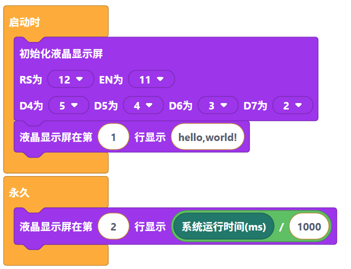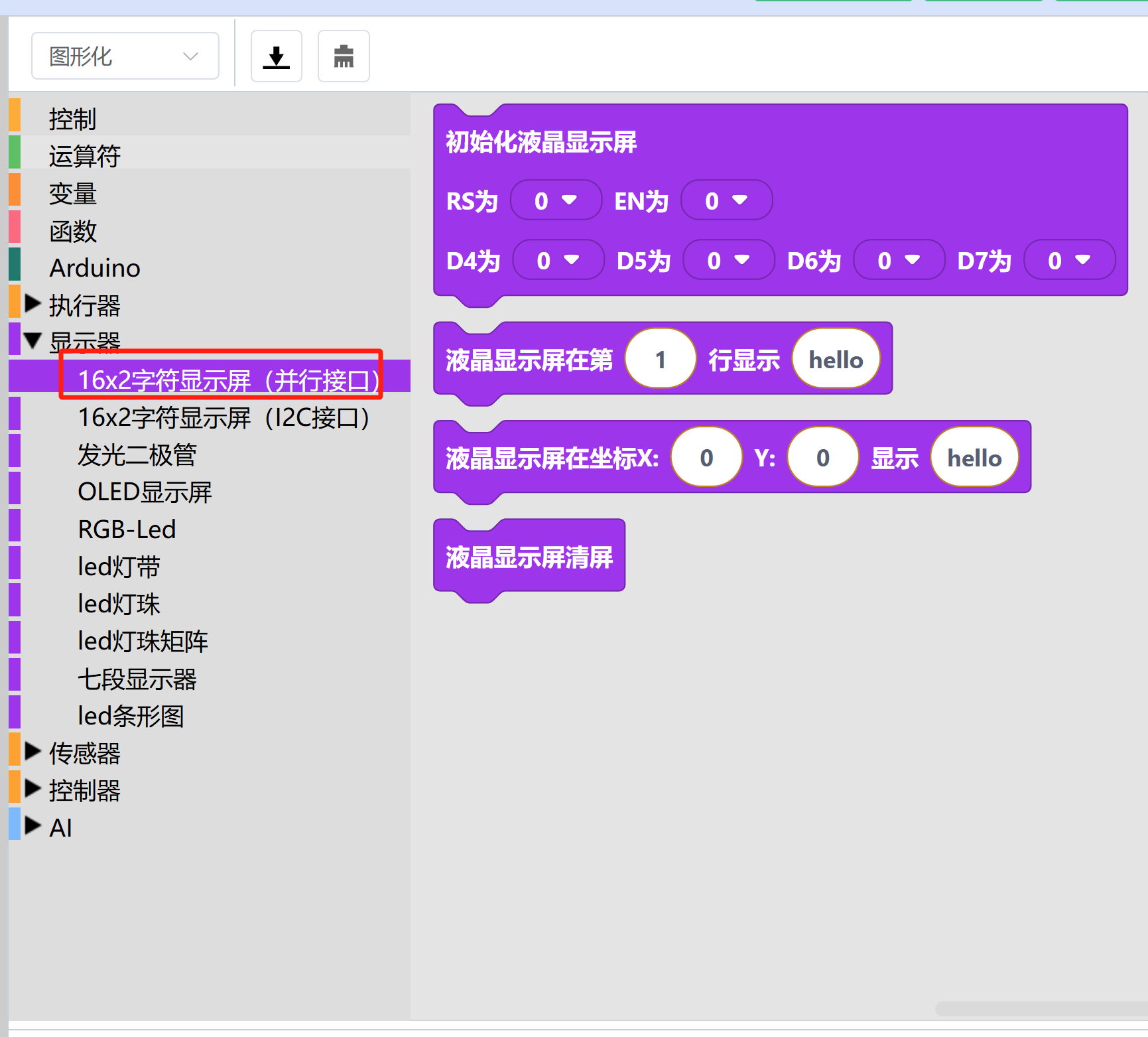 可在“显示器”中的“16*2 字符显示屏(并行接口)”,找到对应的图形化代码块。