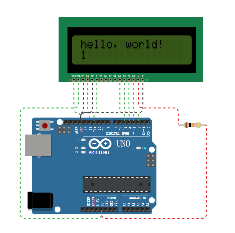 - VO:对比度调节引脚,通过调节液晶显示的对比度,使显示内容清晰可见,连接 Arduino 板的 GND 引脚