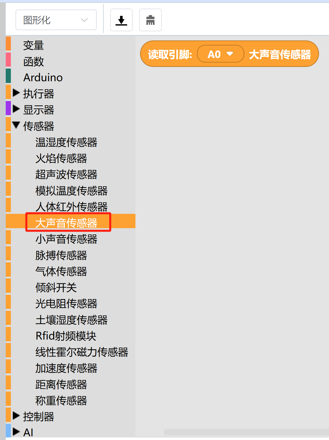 可在“传感器”中的“大声音传感器”,找到相应图形化代码块。