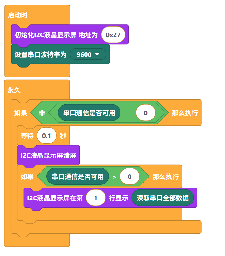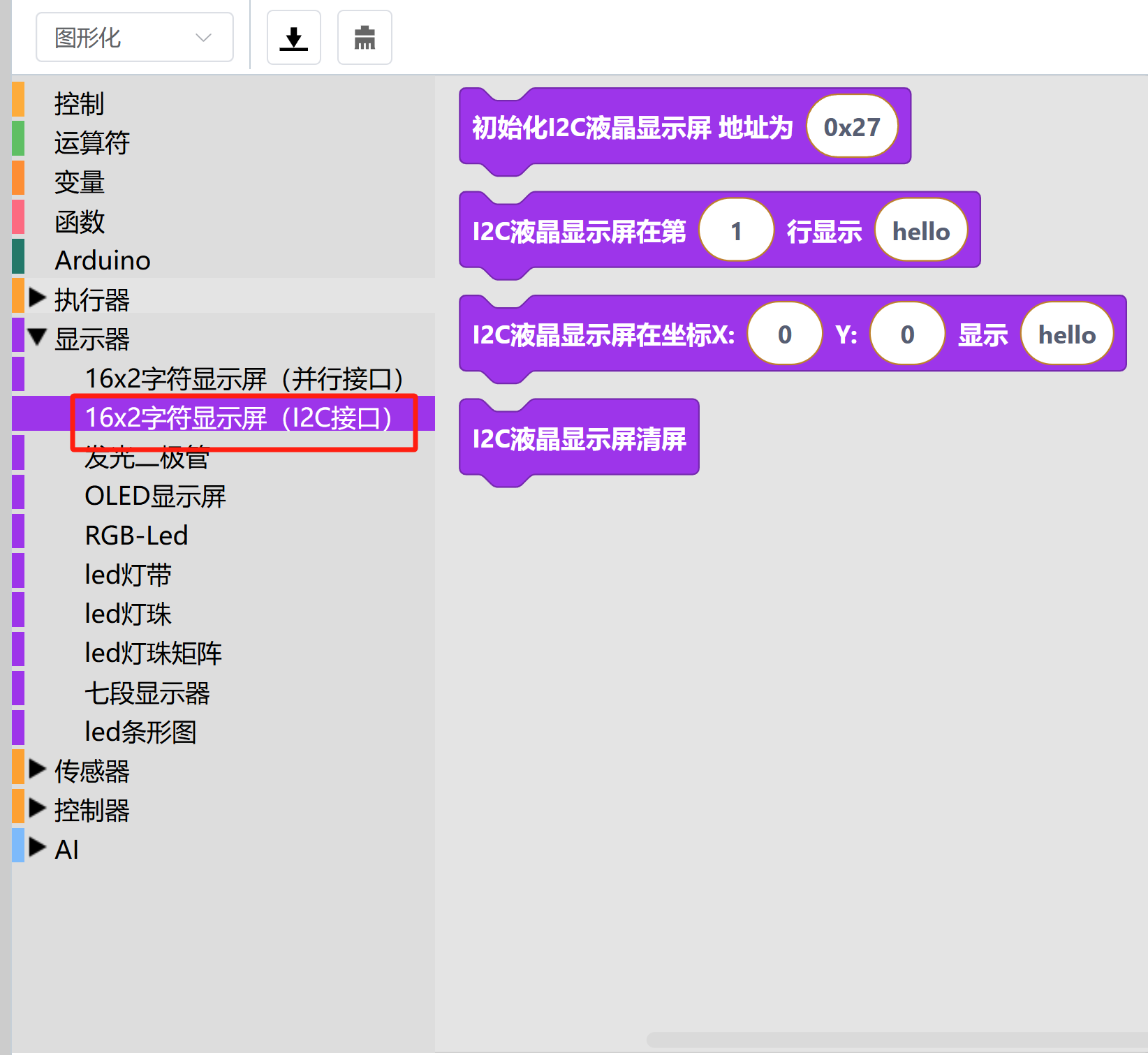 可在“显示器”中的“16*2 字符显示屏(I2C 接口)”,找到对应的图形化代码。