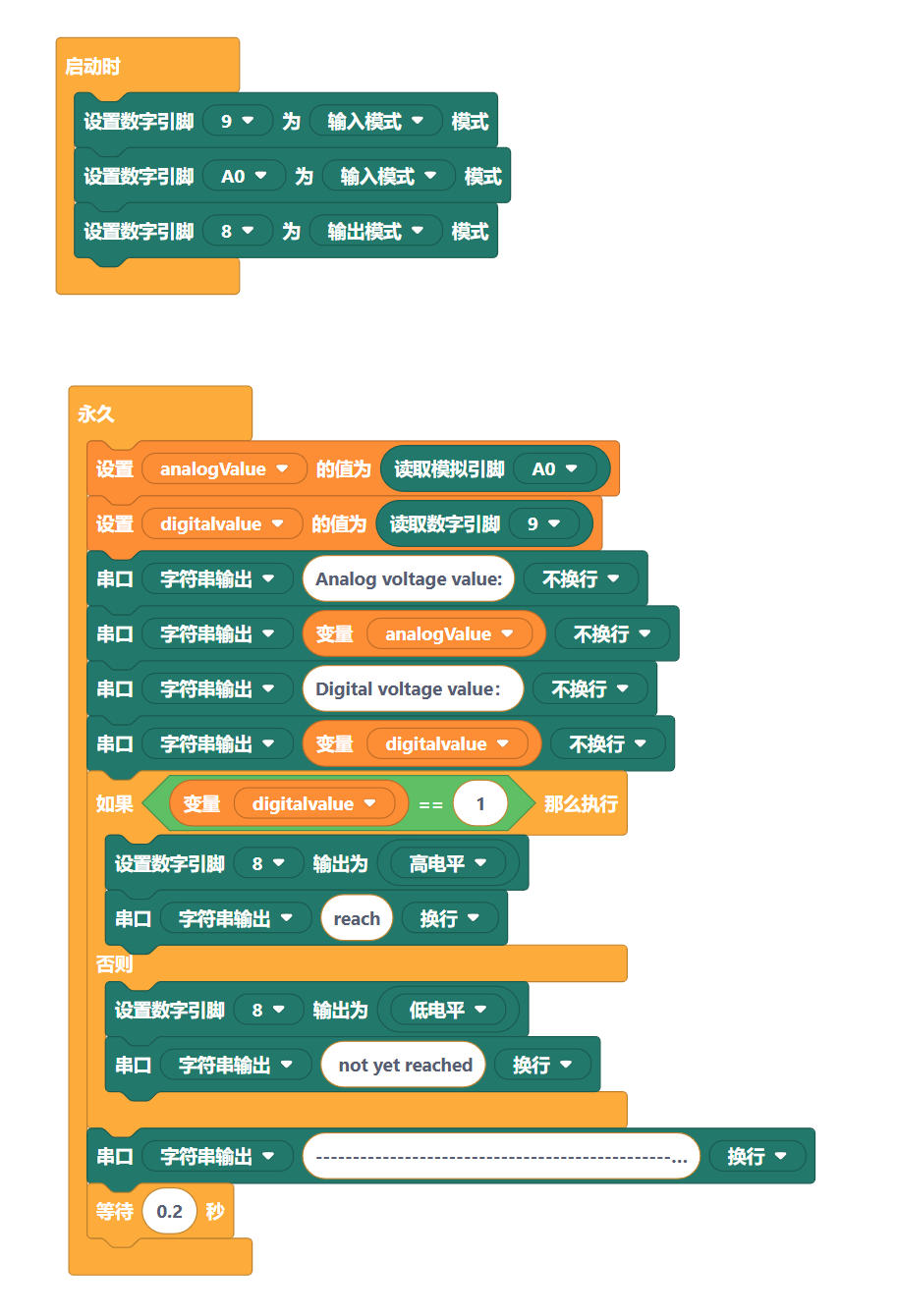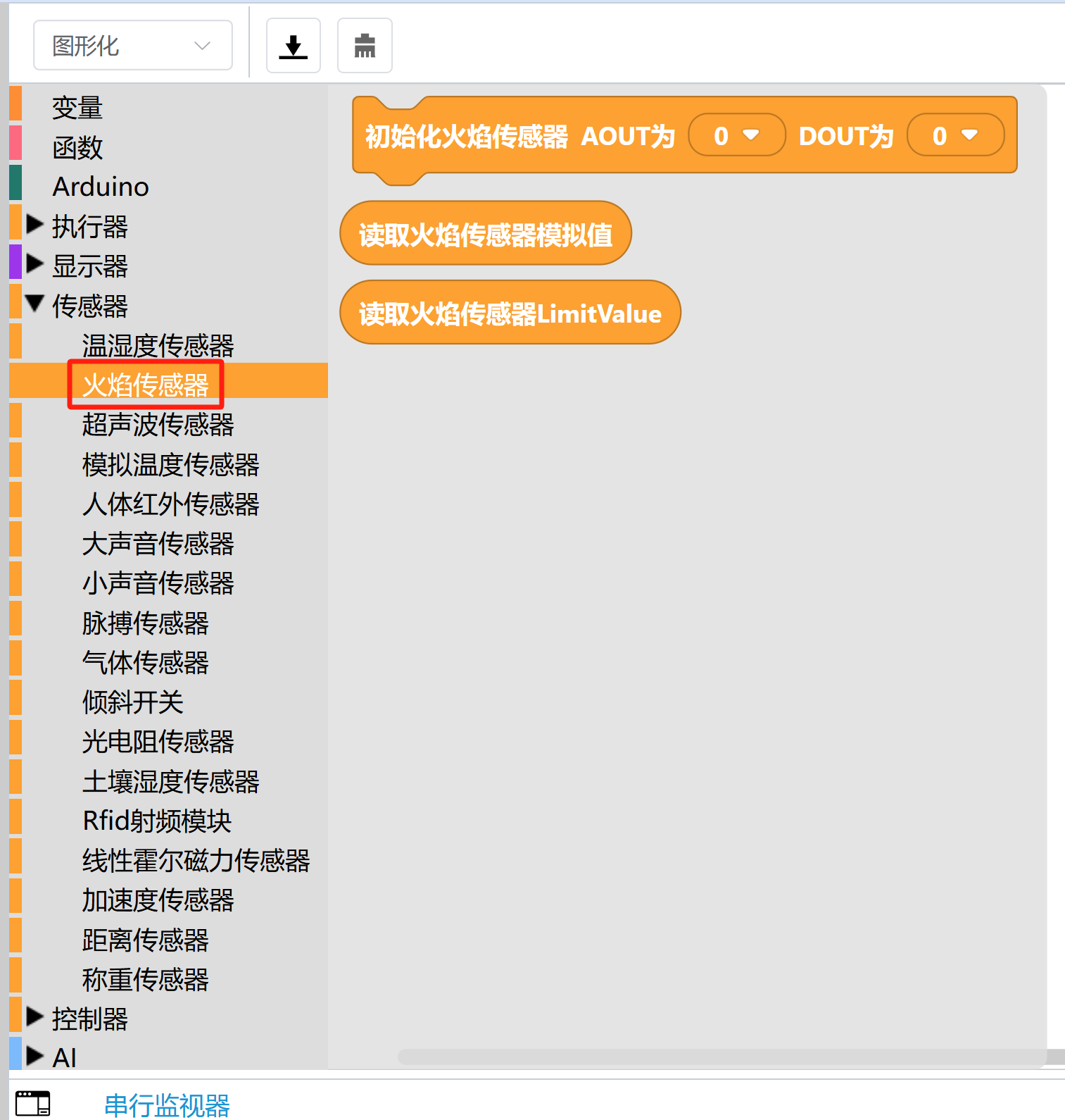 可在“传感器”中的“火焰传感器”,找到相应图形化代码块。