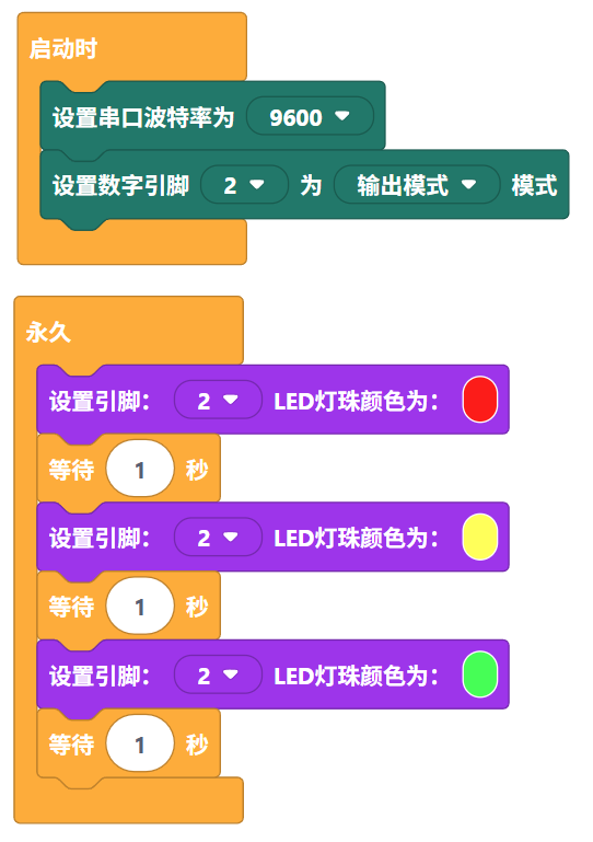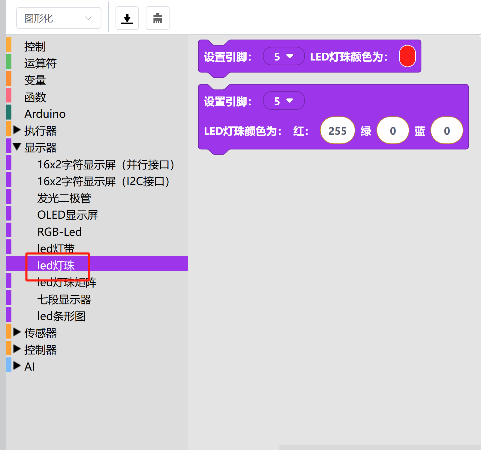 可“显示器”中的“led 灯珠”,找到对应的图形化代码块。