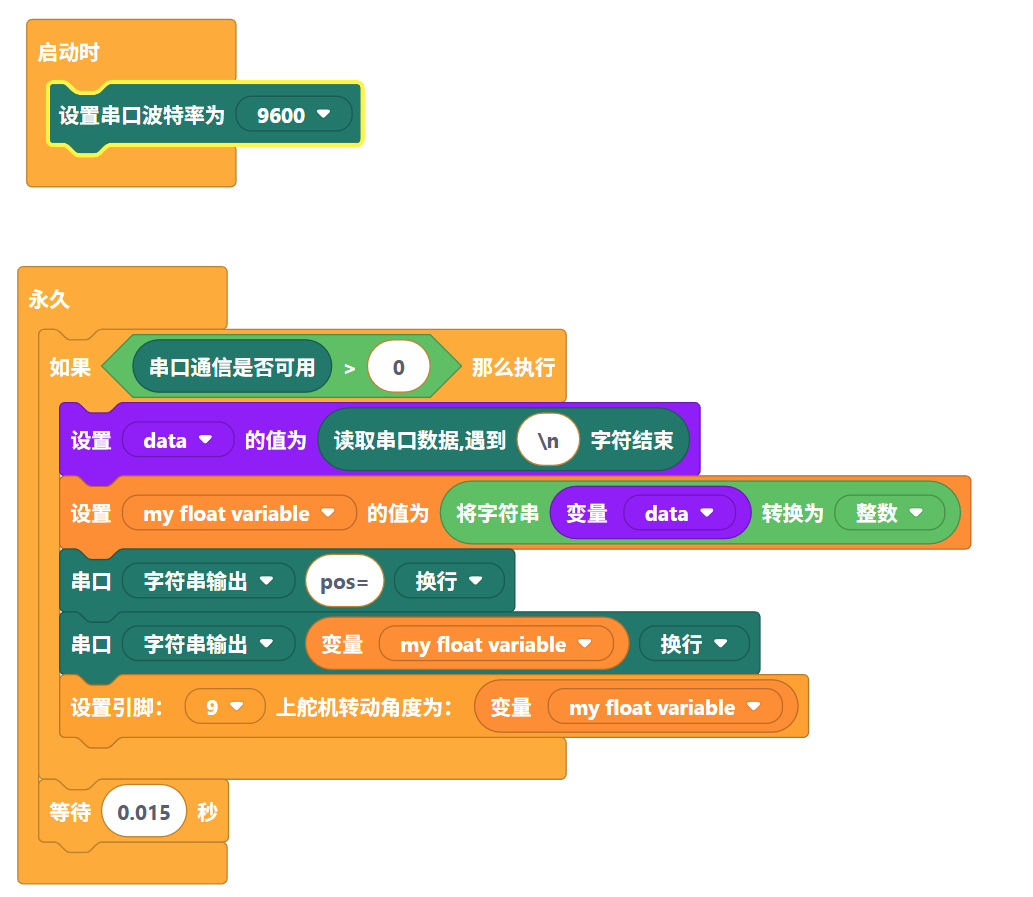 - 判断串口通信是否可用,并以换行符“\n”为界限,读取换行符之前的串口信息,转动舵机