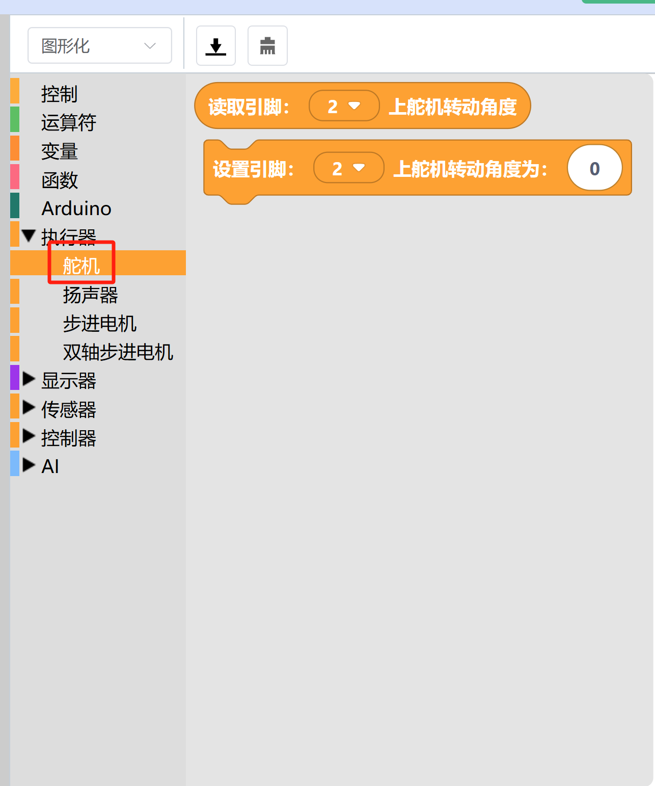 可在“执行器”中的“舵机”,找到相应图形化代码块。