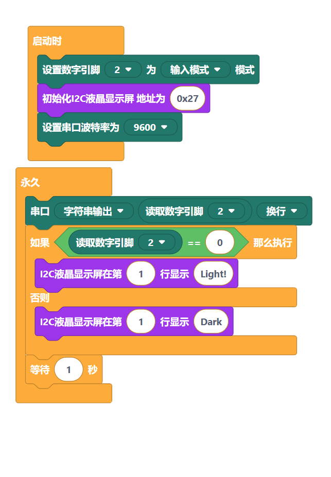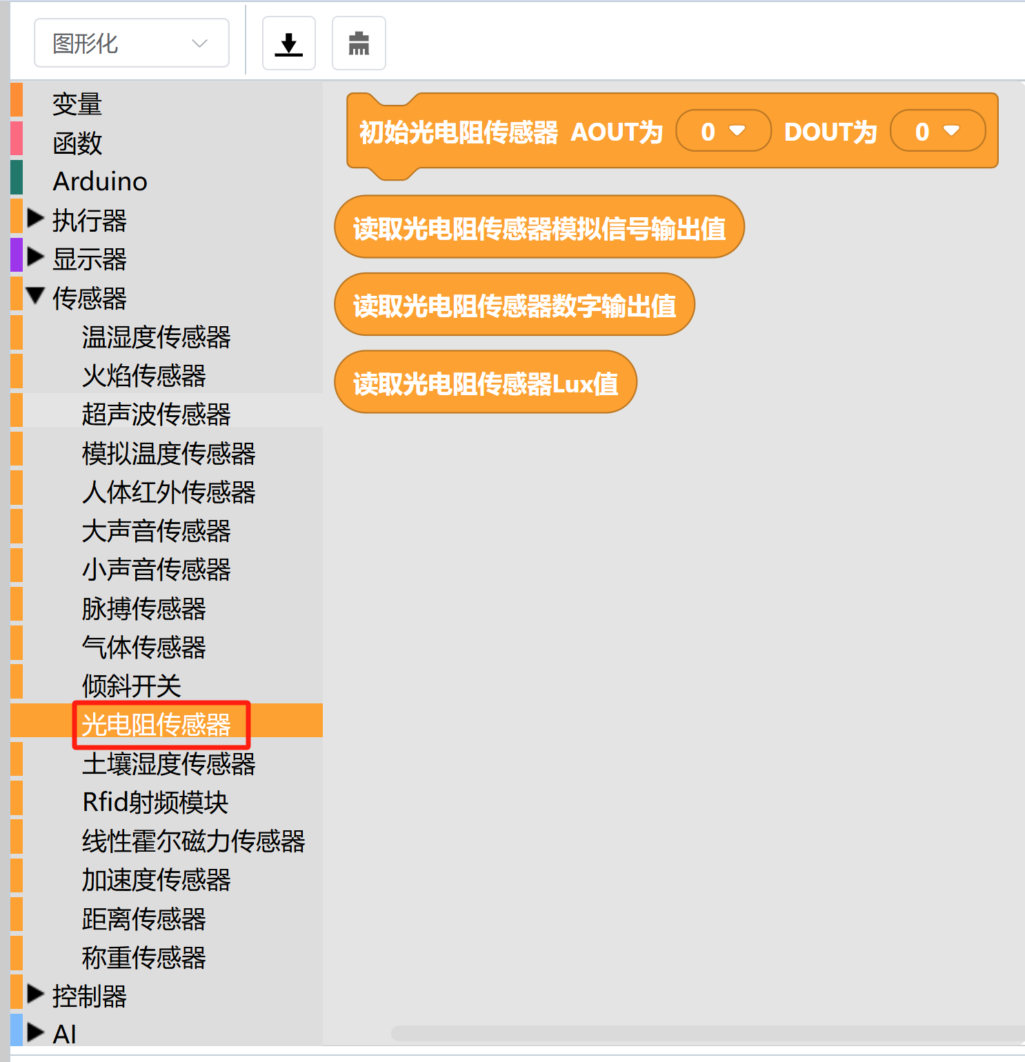 可在“传感器”中的“光电阻传感器”,找到相应图形化代码块,也可通过“读取数字引脚”,读取光电阻传感器状态,是否达到阈值。