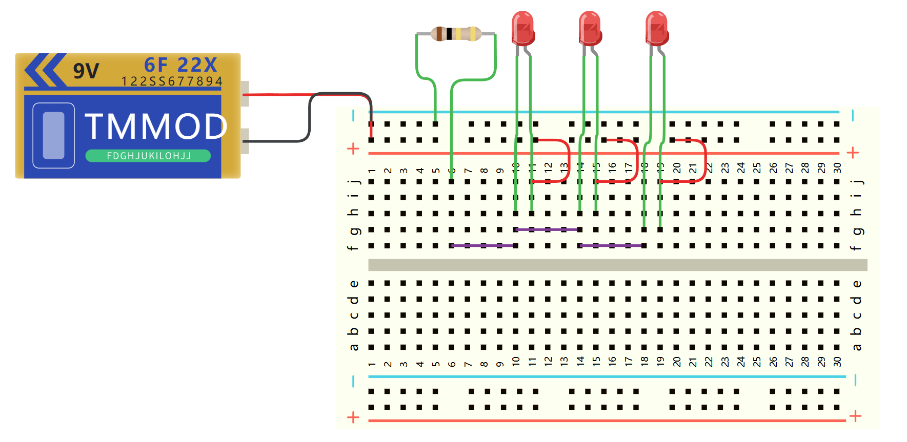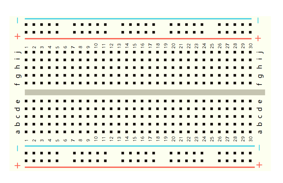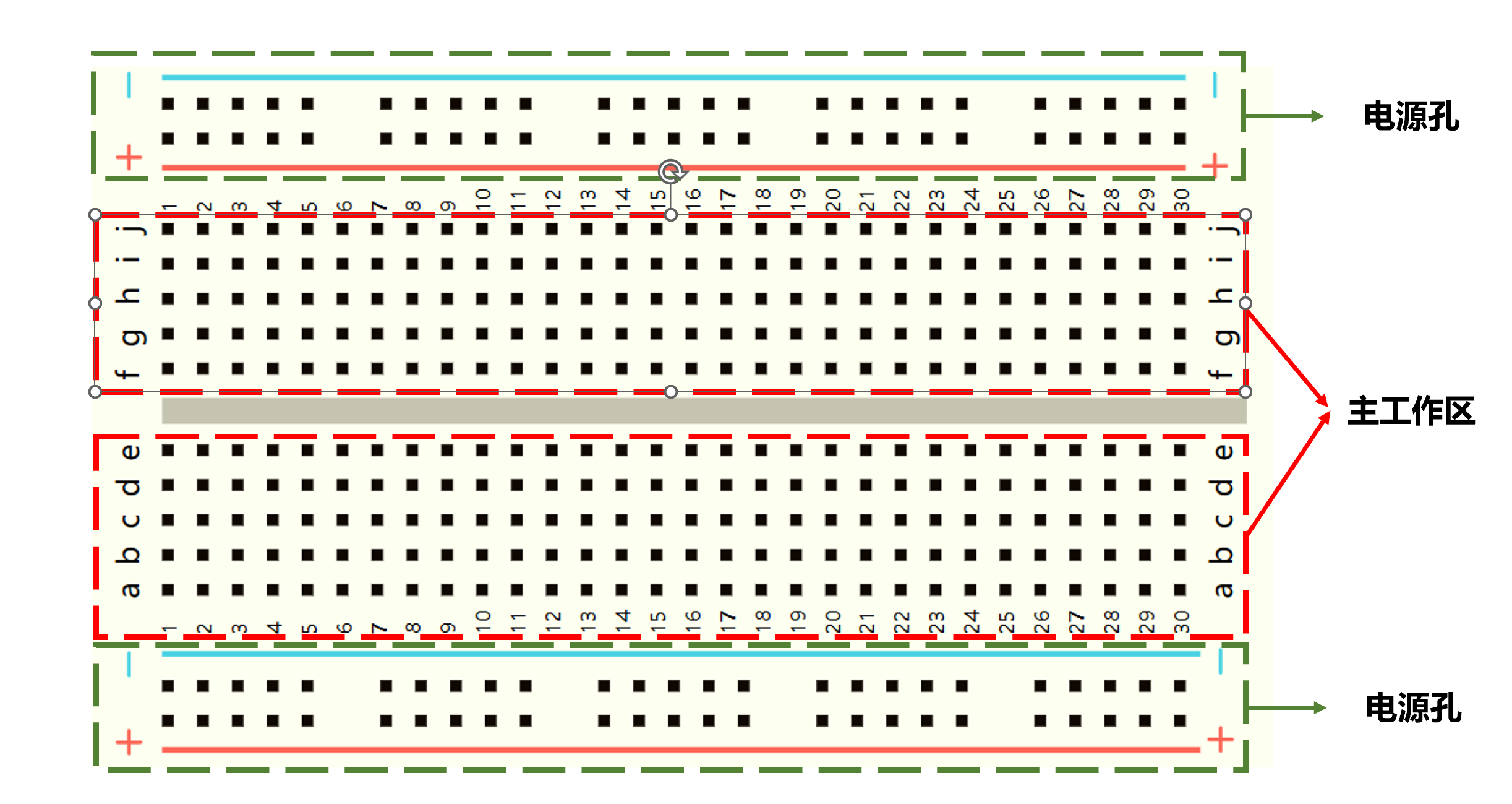 连接孔分为上下两部分,是我们的主工作区,用来插接原件和跳线。在同一列中的 5 个插孔(即 a-b-c-d-e,f-g-h-i-j)是互相连通的;列和列(即 1-30)之间以及凹槽上下部分(即 e-f)是不连通的。