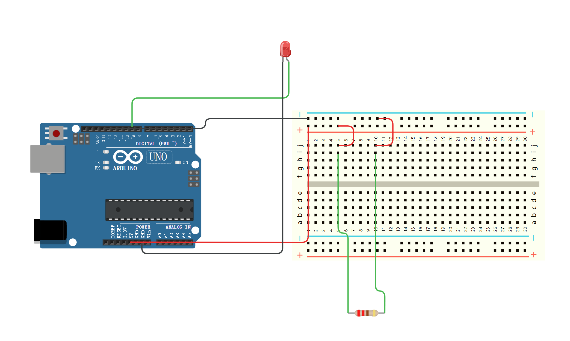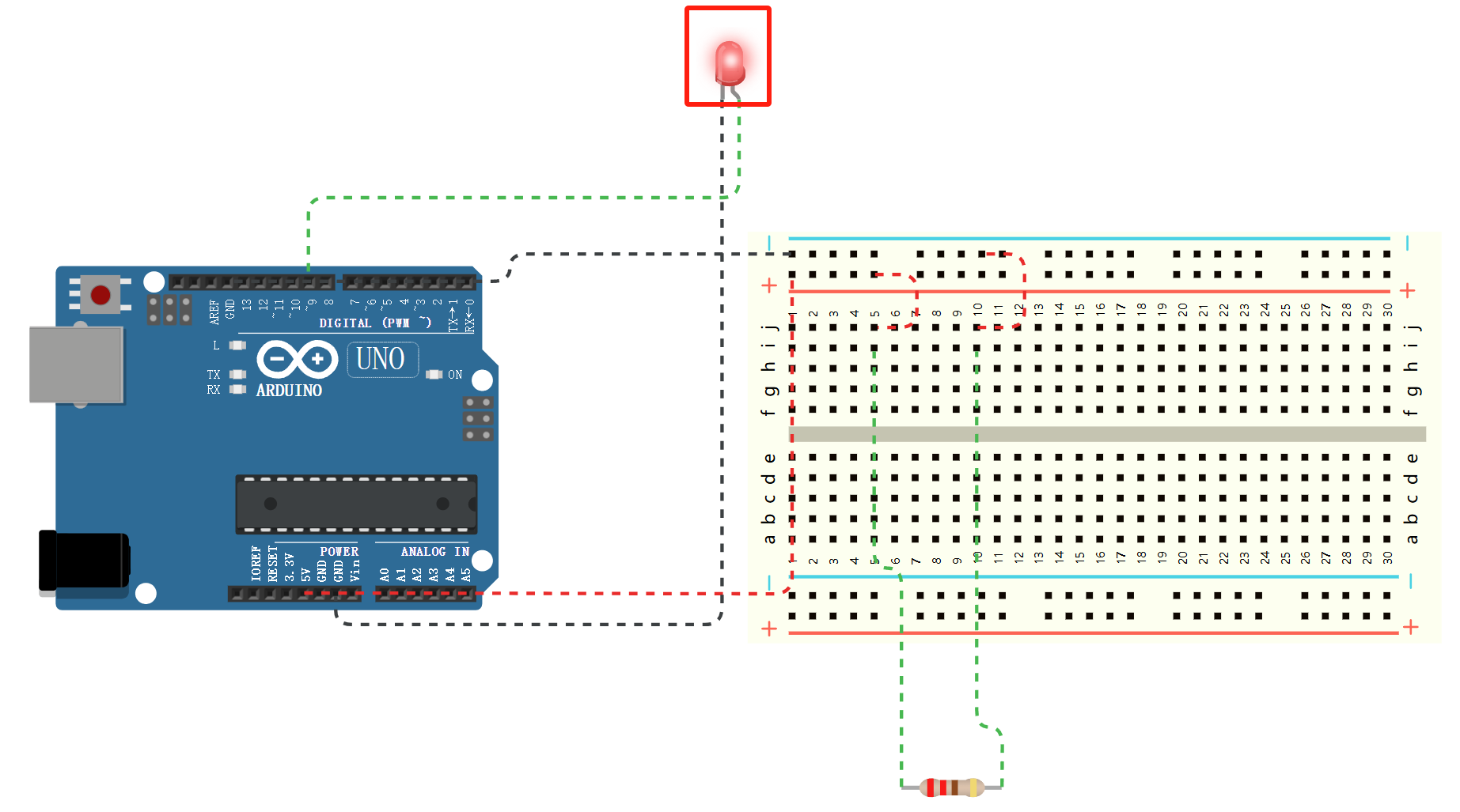 以使用面包板连接电阻来点亮一盏 LED 灯为例