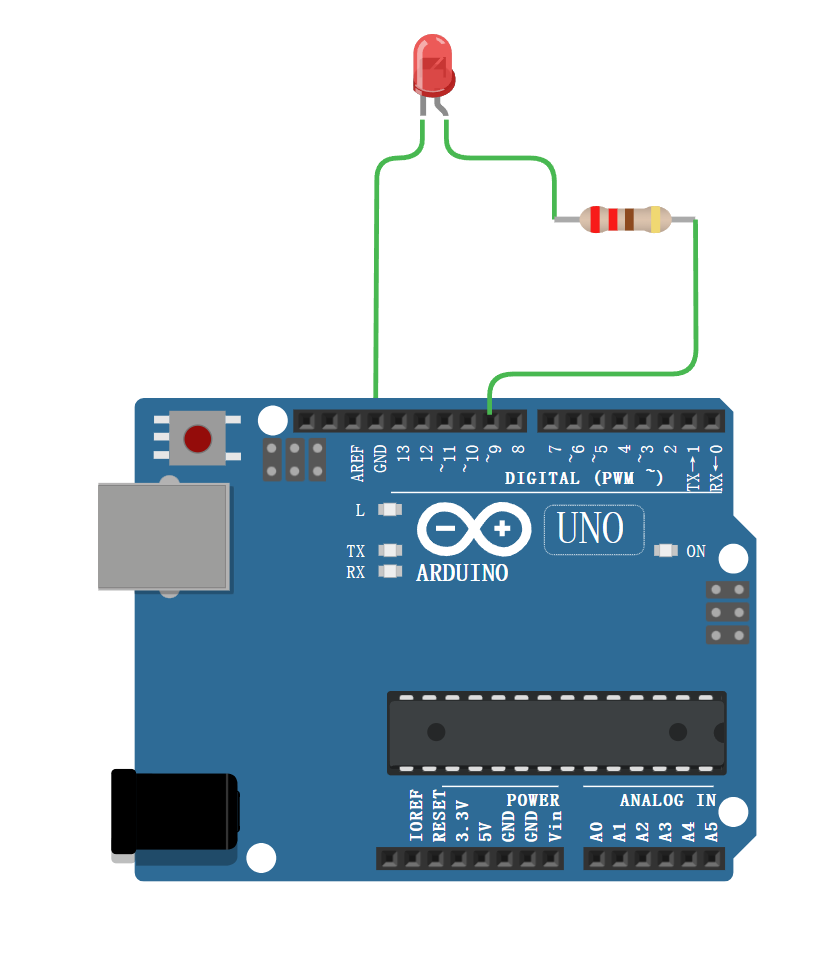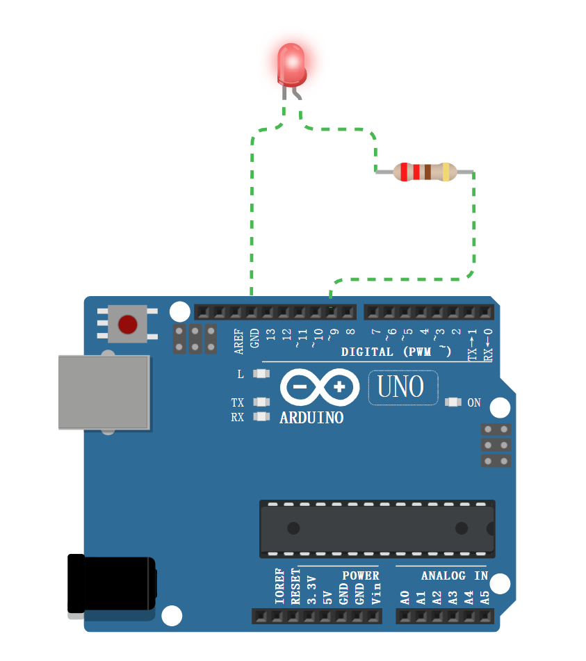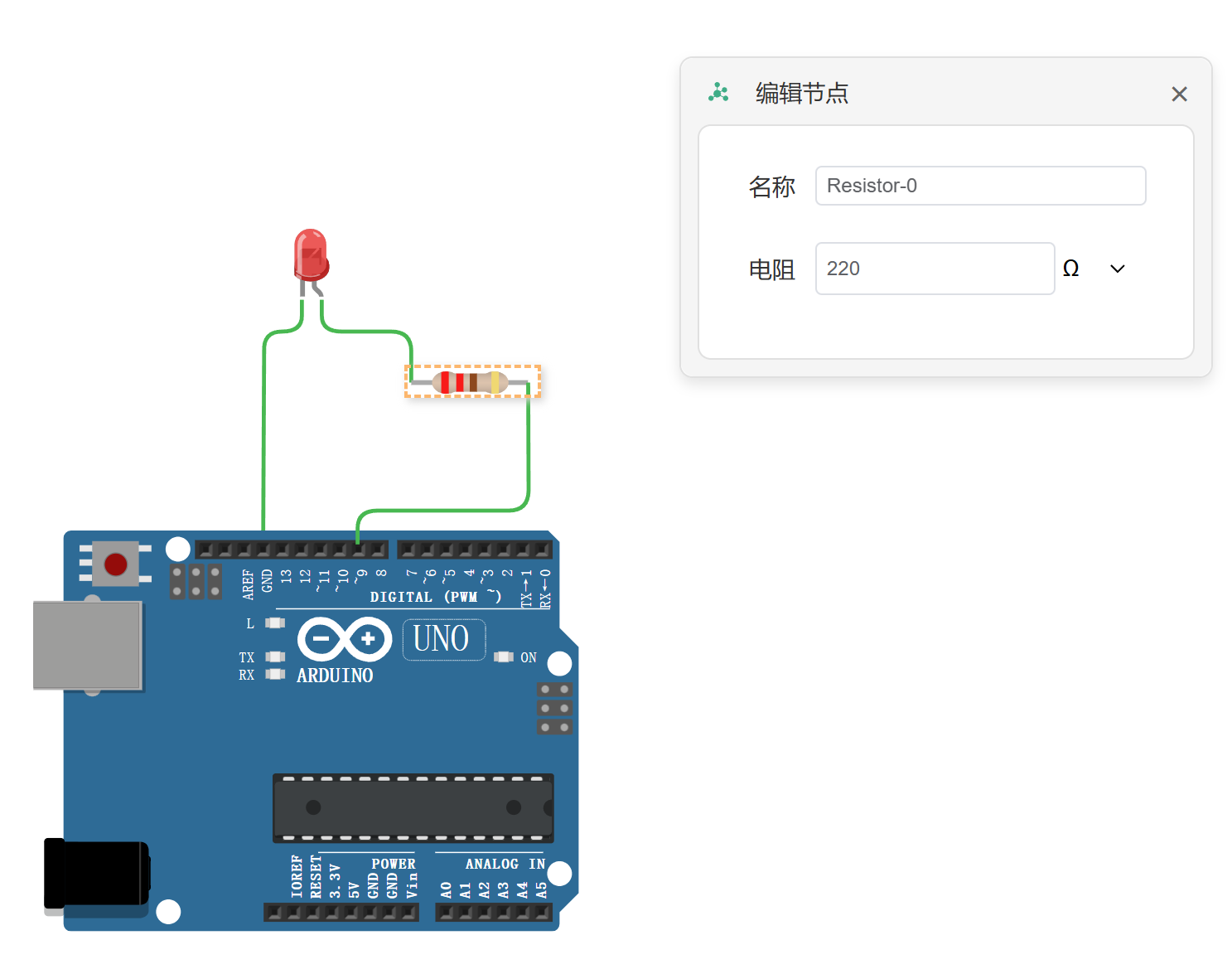 以点亮一盏 LED 灯为例,为了防止电流过大损坏其他元件,Arduino 开发板在连接一盏 LED 灯外还要连接上电阻。不同的阻值有不同的色环,我们可以实现在修改电阻阻值后,色环电阻能够有颜色的变化