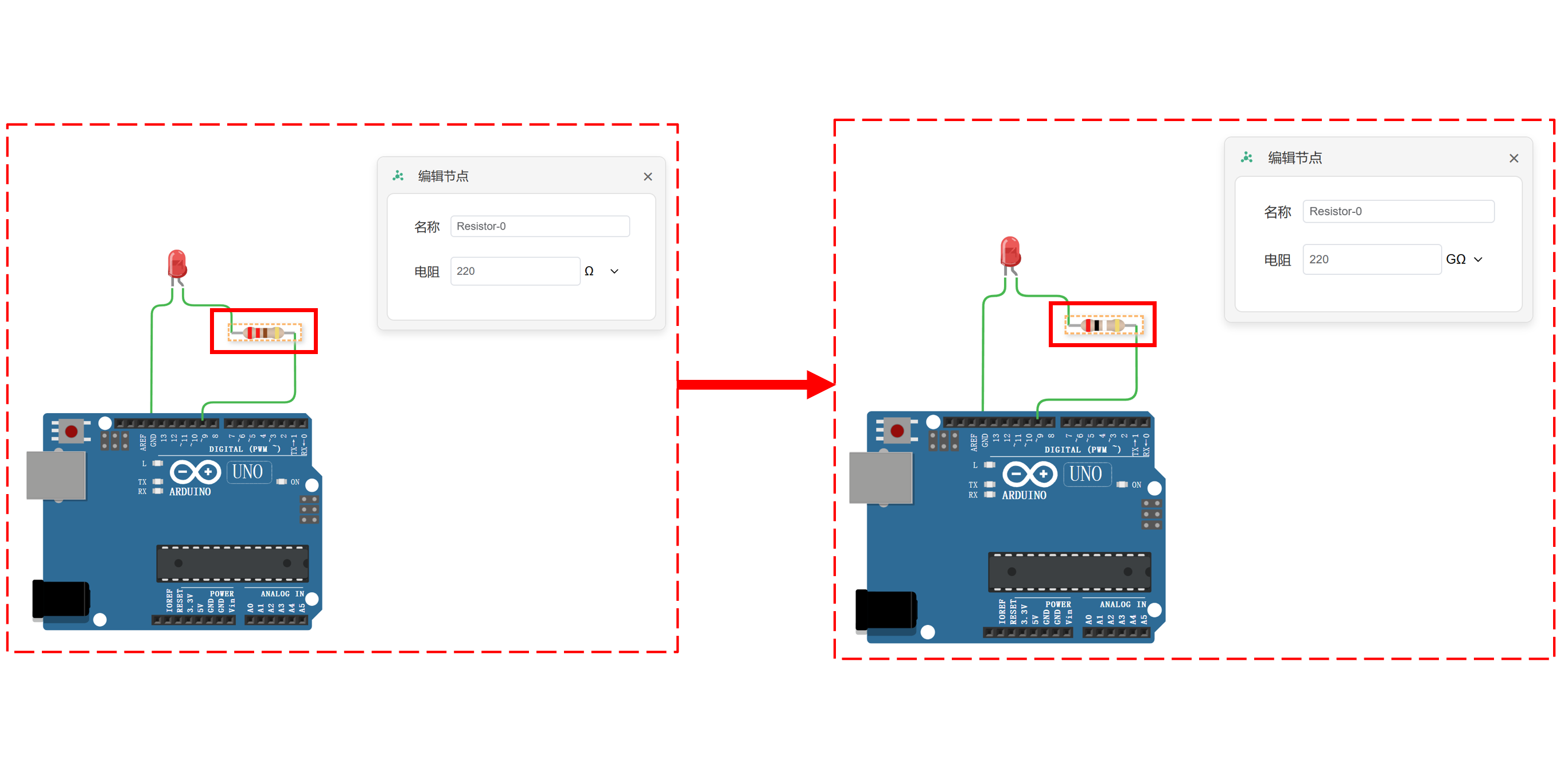 在操纵案例过程中,我们可以点击“电阻”,平台会出现修改电阻值的编辑框