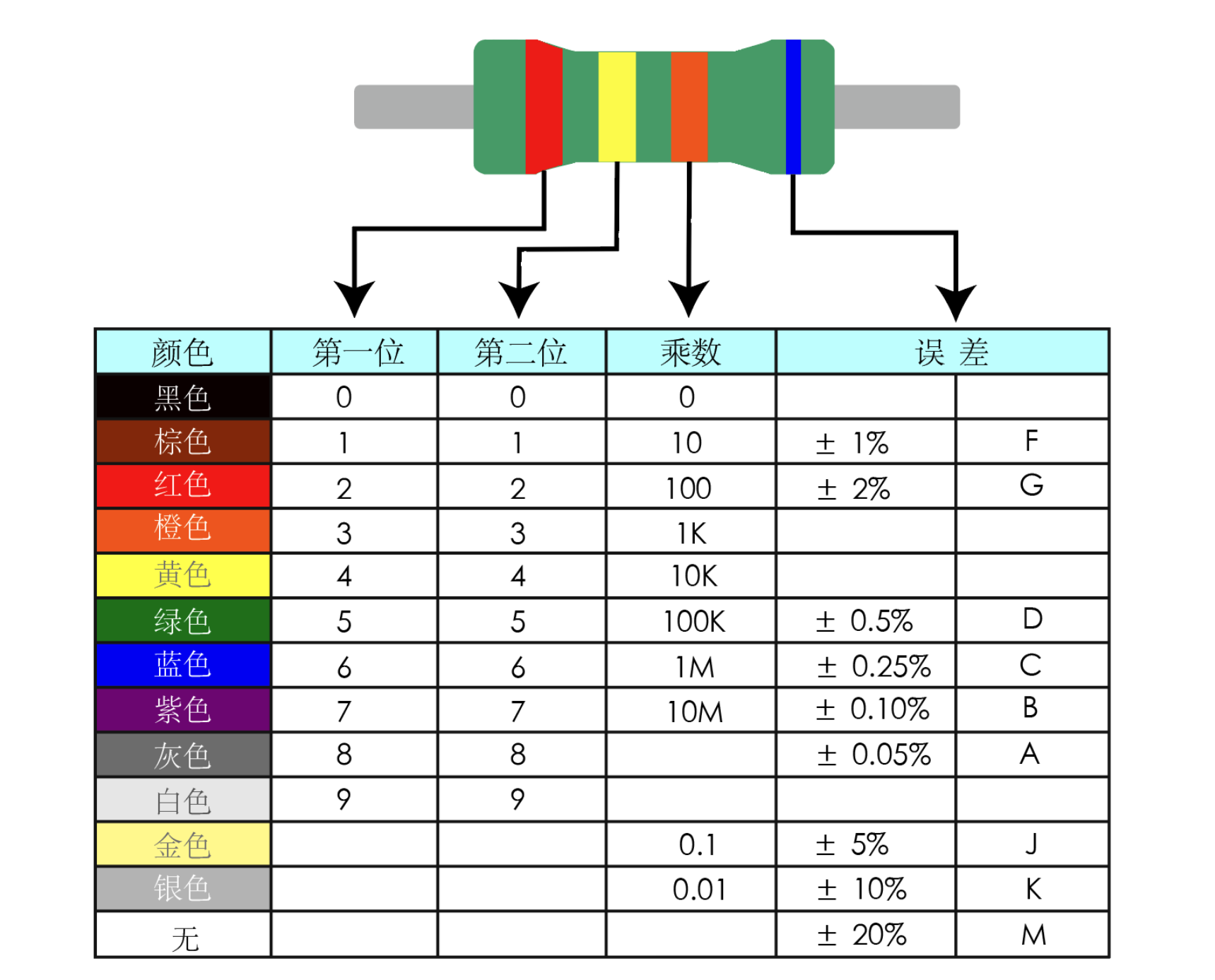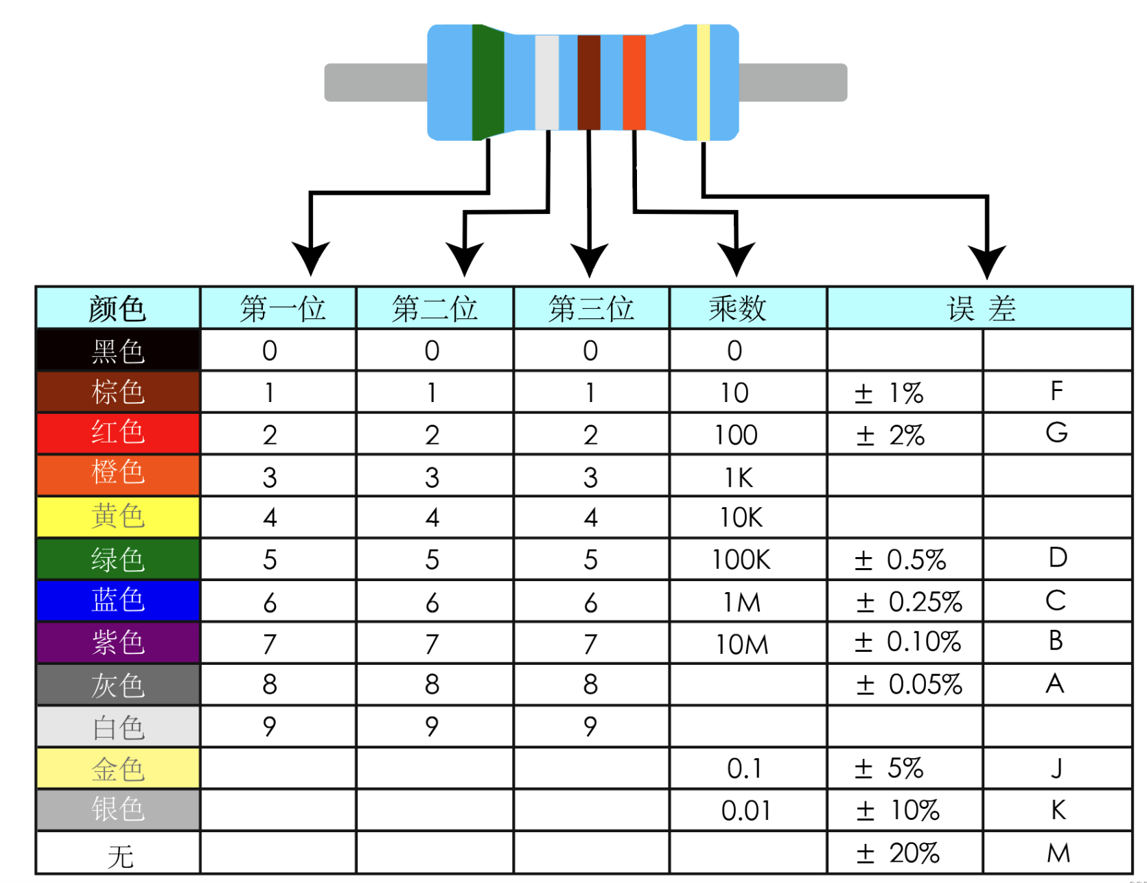 根据色环的数量不同一般分为四色环电阻和五色环电阻。每个色环所代表的含义各不相同,不同色环的颜色代表不同的数字,比如红色色环表示的是数字 2,色环不同位置代表不同的意义,比如第二个色环表示的是该电阻值得第二个有效数字。