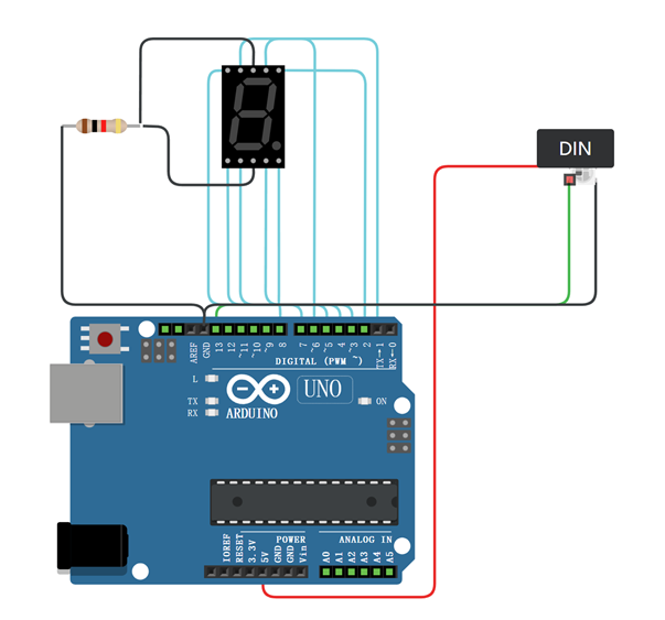 我们拖动右侧的元器件,选择 Arduino 开发板,发光二极管与电阻,进行连线。