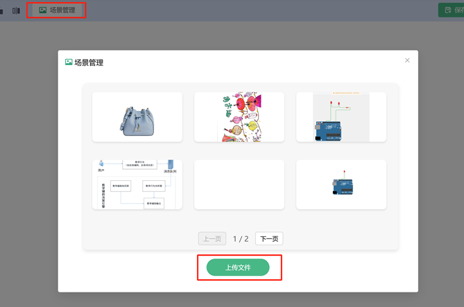 点击“场景管理”后,点击“上传文件”,再选中上传的场景,即可切换整体画布,如下图: