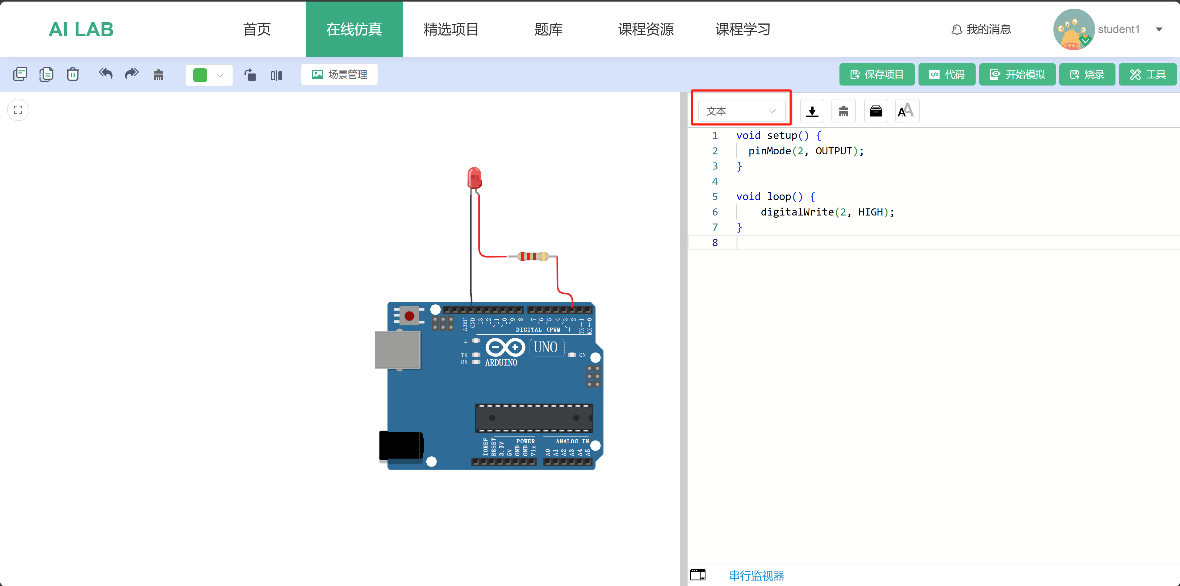 现在,如果想让我们将点亮一盏 LED 灯的项目运行起来,我们还需要代码,我们支持两种编程模式,支持文本代码与图形化代码,首先我们点击右上角“代码”模块,选中“文本”,即可编辑文本代码。