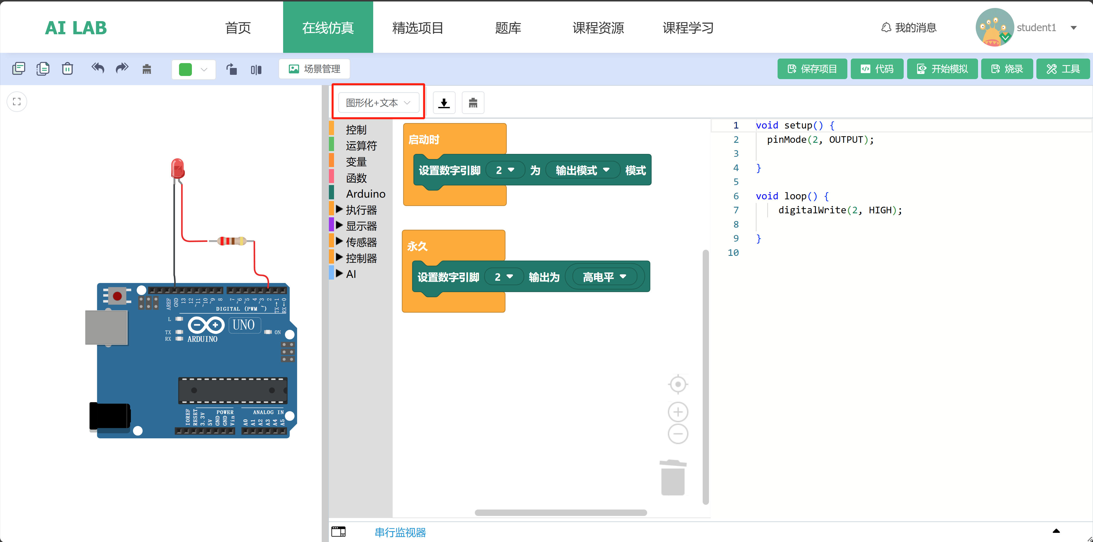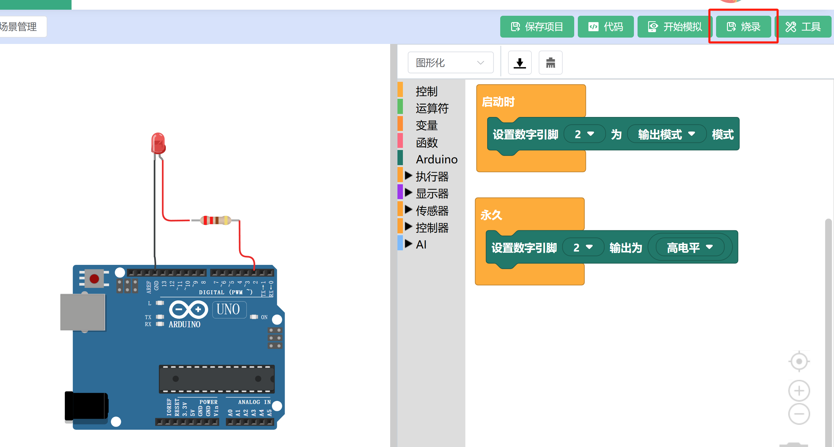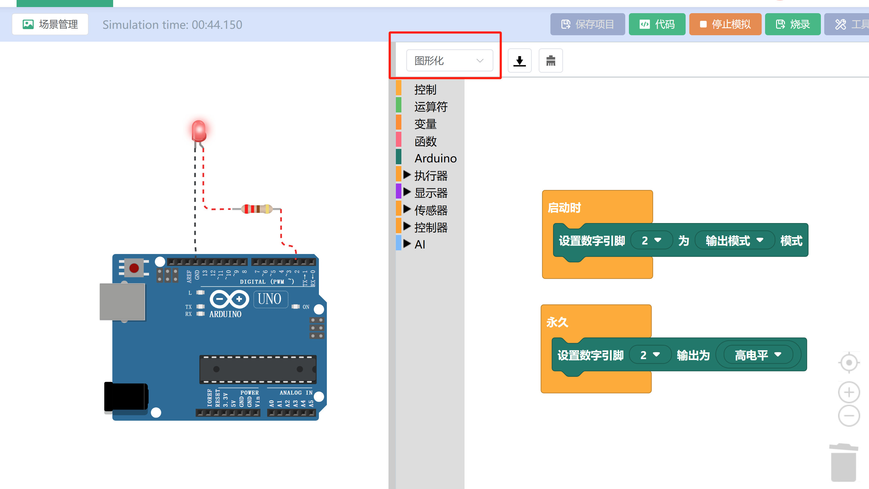 当我们点击代码模式为“块”时,则会转到图形化代码。当我们编写完程序后,同样点击“开始模拟”,会观察到小灯亮起的状态。