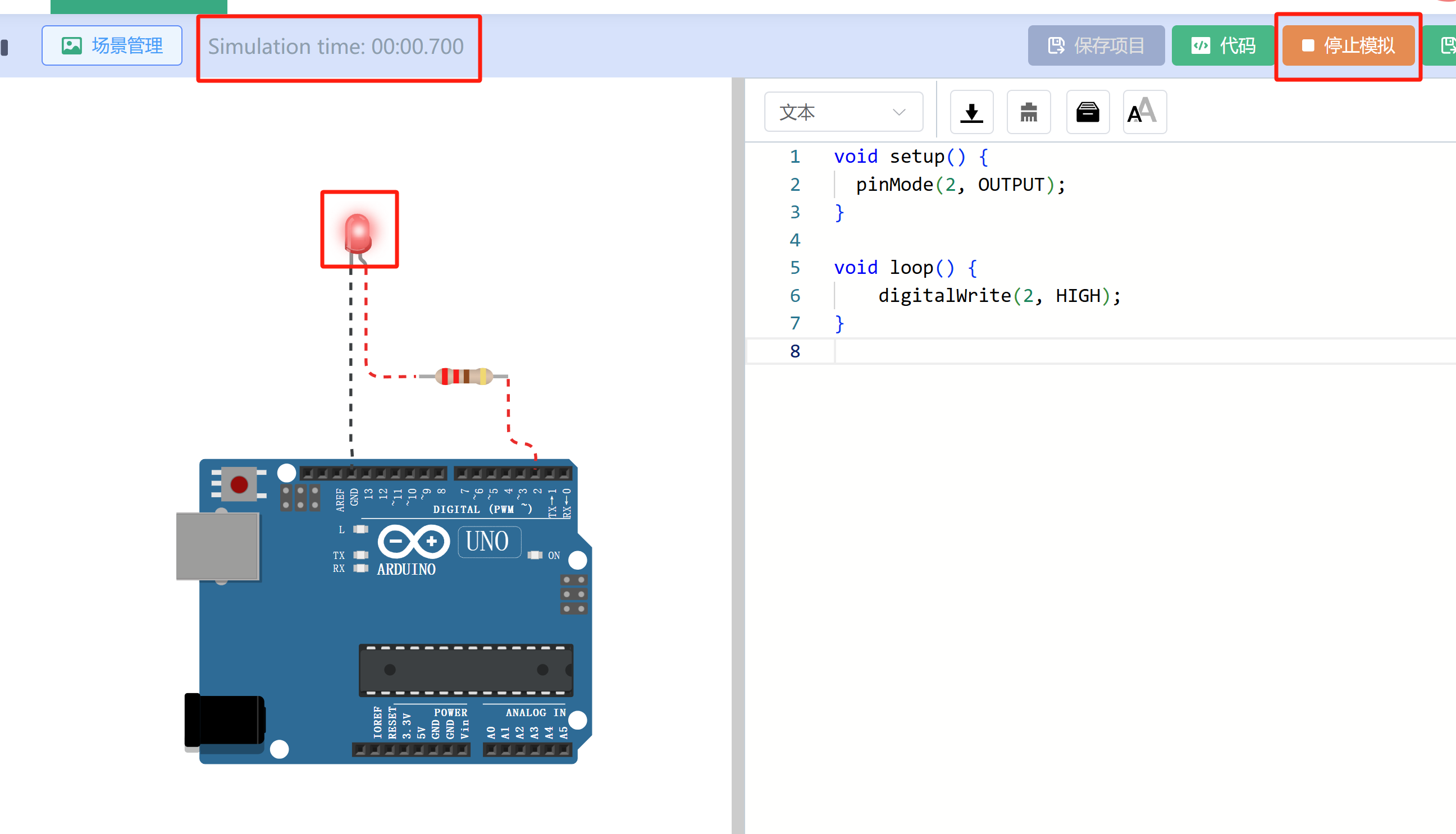 当我们点击“开始模拟”后,则会观察到 LED 灯点亮的效果。