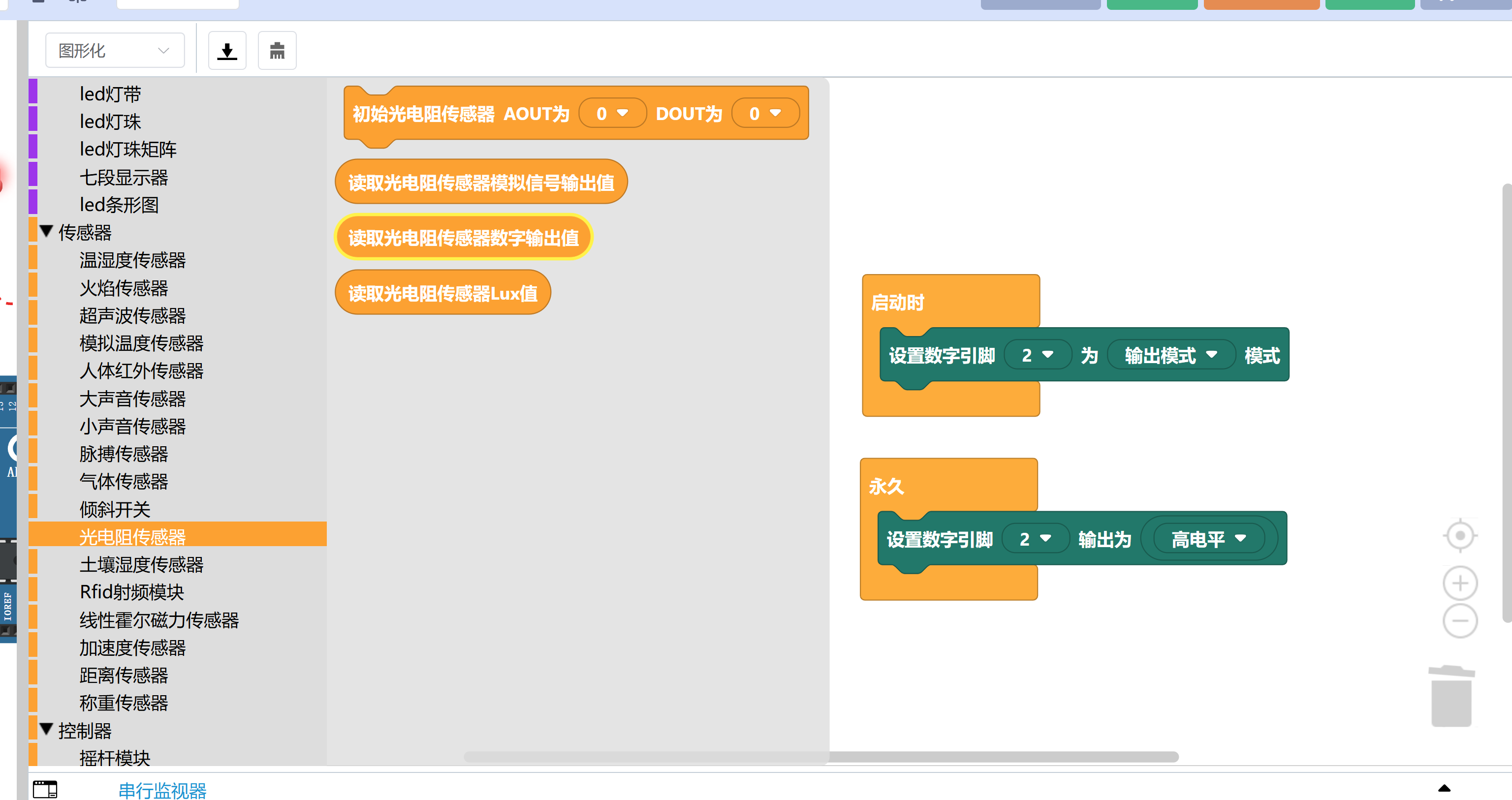 图形化代码编辑器中,覆盖所有元器件的图形化操作代码块,拖动即可使用。
