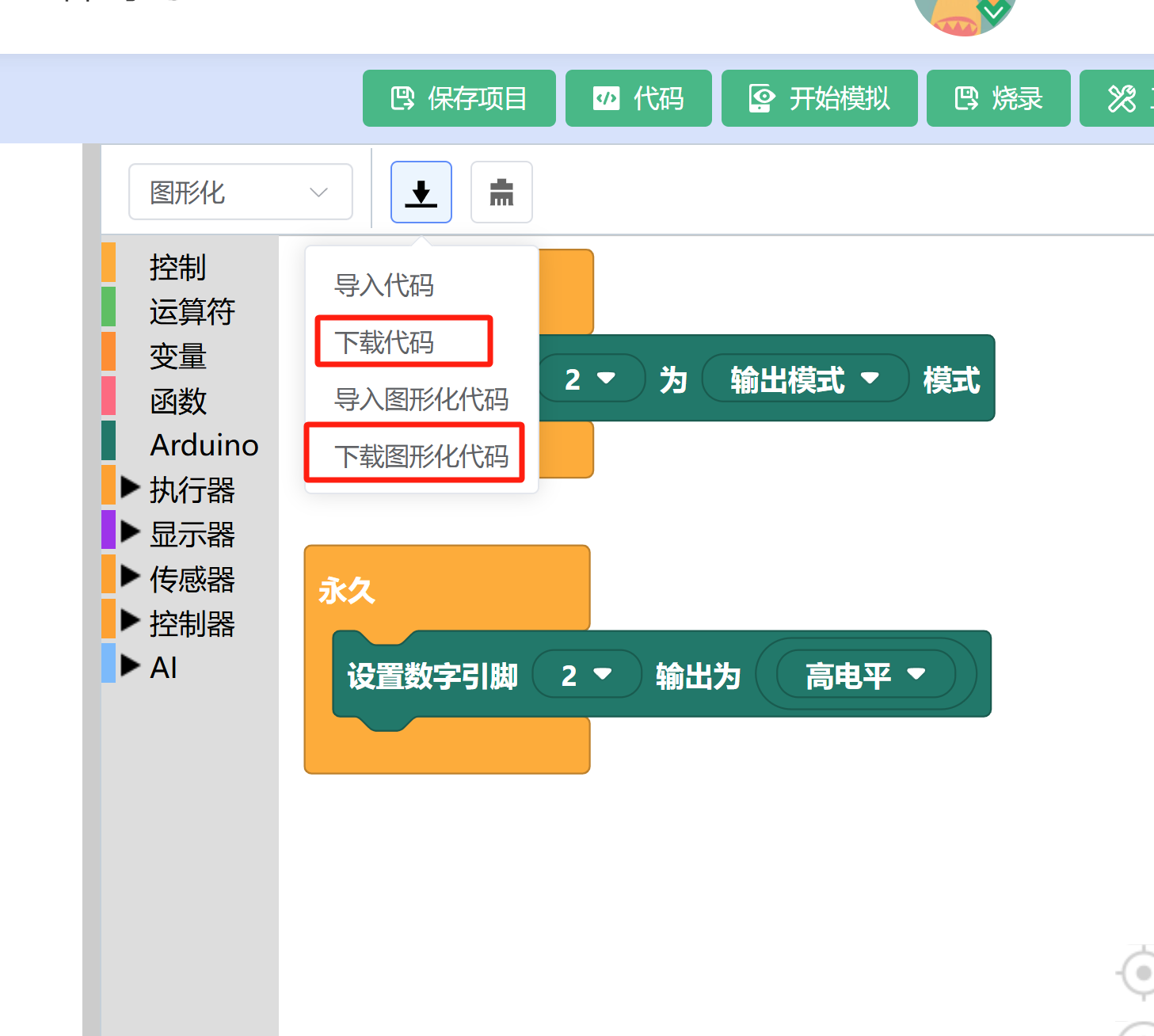 其次是代码,我们代开代码栏,选中此下载按钮,便可以下载和导入文本代码或图形化代码。