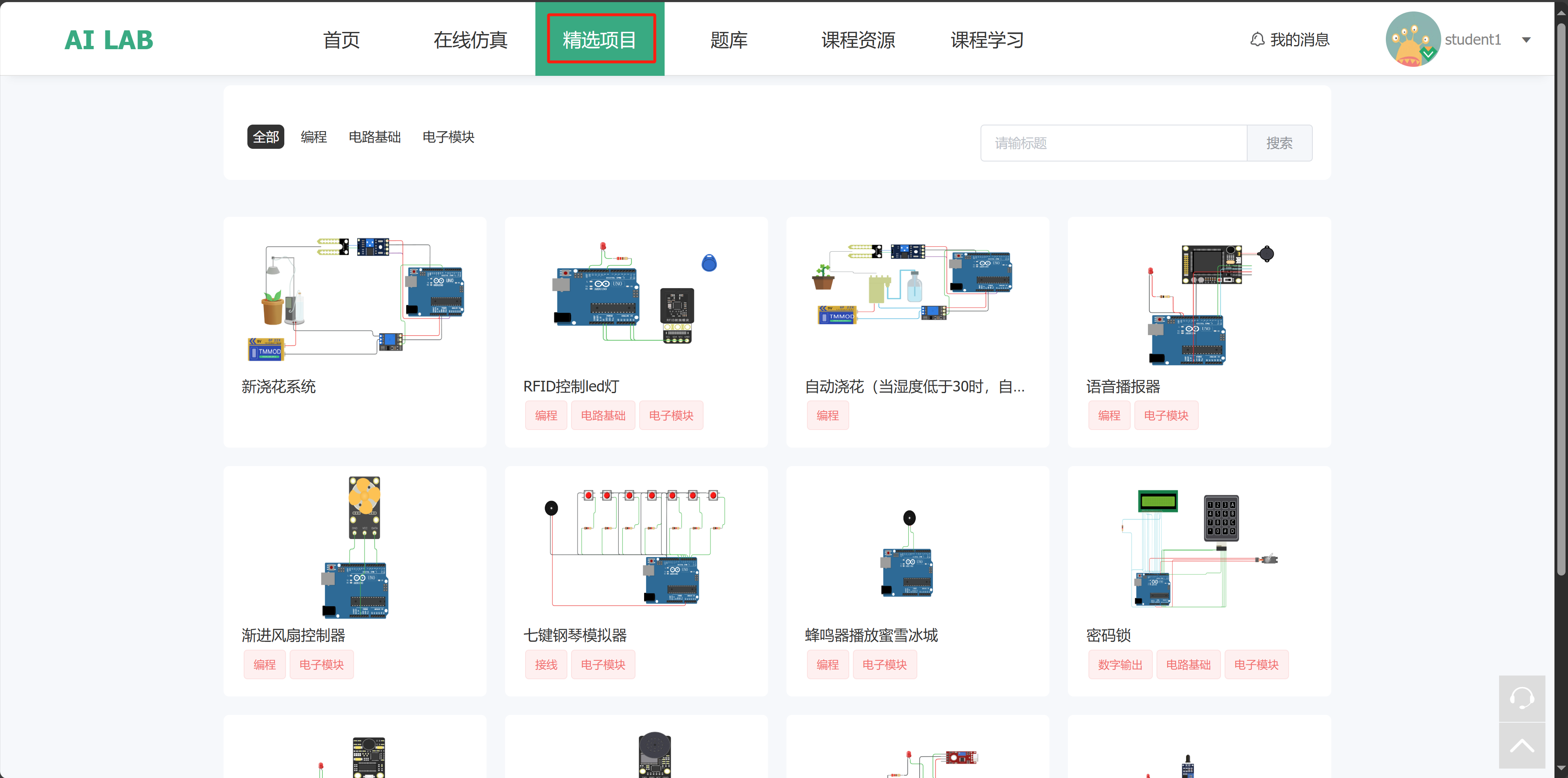 精选项目模块中,提供了丰富的项目案例,这些项目案例包含所有在在线仿真中的元器件,供用户参考并进行学习,可针对标签进行分类,由管理员设置并发布,所有用户均可查看。